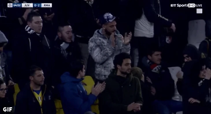 Болельщики «Ювентуса» аплодисментами встретили второй гол нападающего «Реала» Криштиану Роналду в первом матче 1/4 финала Лиги чемпионов (0:3).