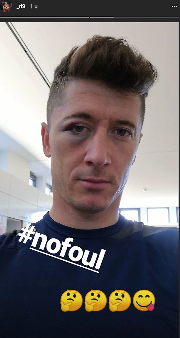 Нападающий «Баварии» Роберт Левандовски получил по лицу во время ответного матча 1/4 финала Лиги чемпионов против «Севильи» (0:0, 2:1 по сумме двух встреч).