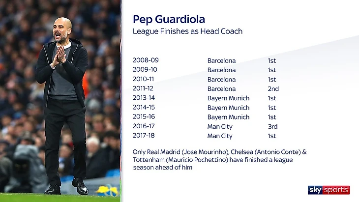 Выше Гвардиолы за последние девять сезонов в одном с ним чемпионате финишировали только Жозе Моуринью с «Реалом», а также Антонио Конте с «Челси» и Маурисио Почеттино с «Тоттенхэмом».