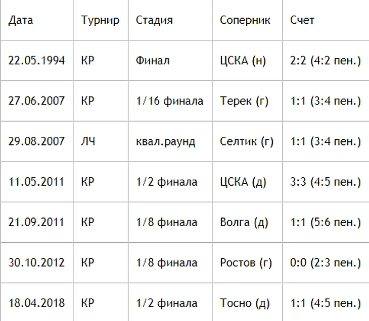 Это поражение стало для московского клуба шестым подряд в послематчевой серии пенальти.