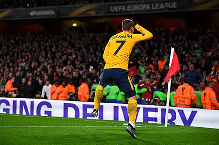Нападающий «Атлетико» Антуан Гризманн сравнял счет в первом матче 1/2 финала Лиги Европы против «Арсенала» (1:1).