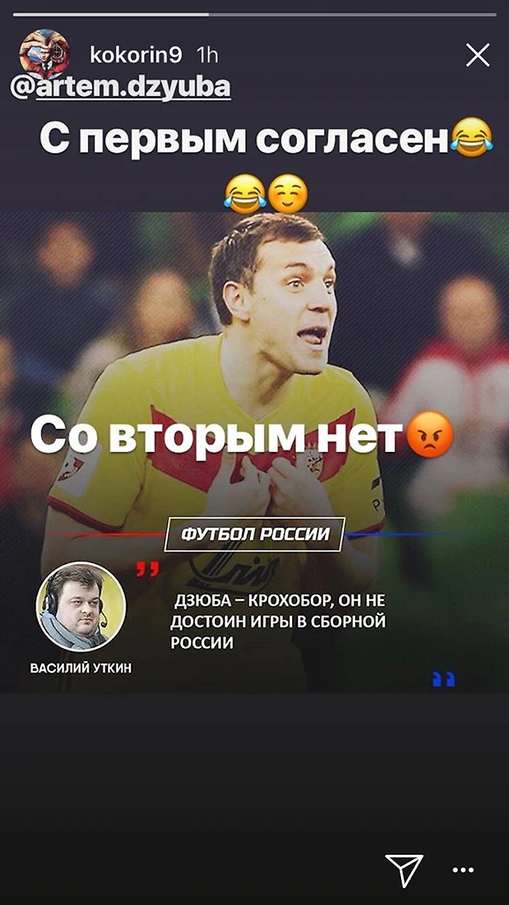 Форвард «Зенита» Александр Кокорин отреагировал на слова комментатора Василия Уткина о нападающем тульского «Арсенала» Артеме Дзюбе.