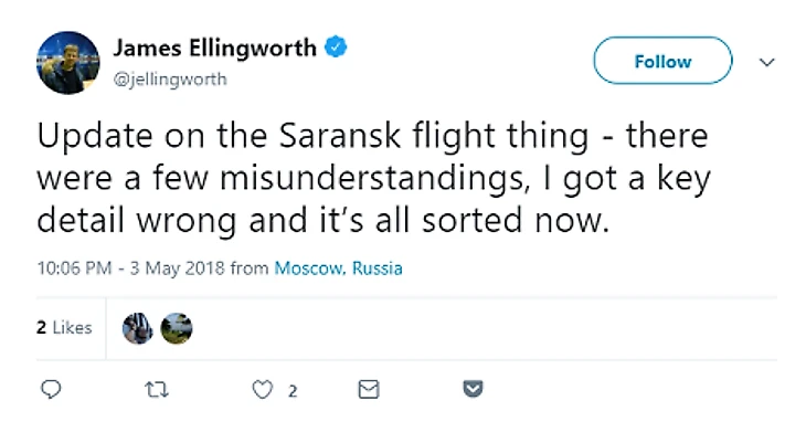 Его регистрация затянулась, поскольку сотрудники «Аэрофлота» никогда не слышали о Саранске и отказывались верить, что они летели туда», – написал Эллингуорт, но позже сообщил, что неправильно понял коллег.