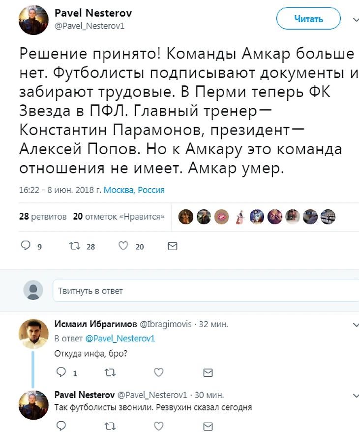 Но к «Амкару» это команда отношения не имеет. «Амкар» умер», – написал Нестеров в твиттере.