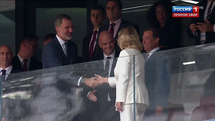 52-летний чиновник смотрит игру на стадионе «Лужники» в компании президента ФИФА Джанни Инфантино и короля Испании Филиппа VI.