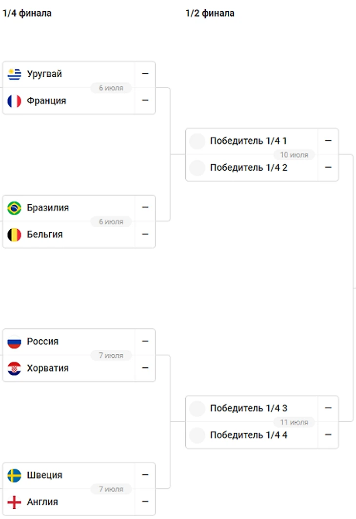 В нижней части сетки Россия сыграет с Хорватией, Швеция встретится с Англией. Матчи состоятся 7 июля. Победители игр Россия – Хорватия и Швеция – Англия встретятся в полуфинале 11 июля.