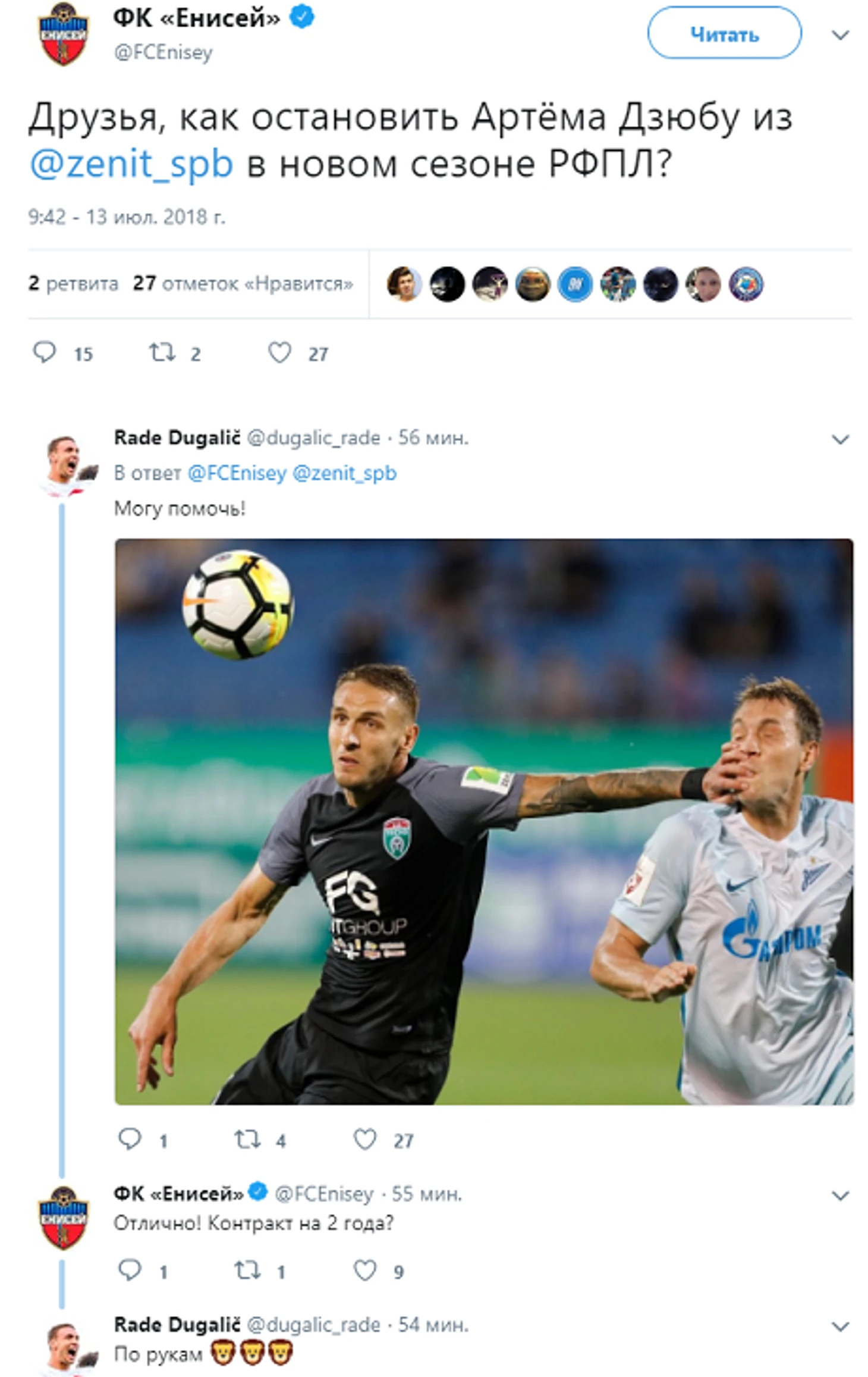 «Енисей» в шуточной форме рассказал о том, как защитник Раде Дугалич заключил контракт с клубом.