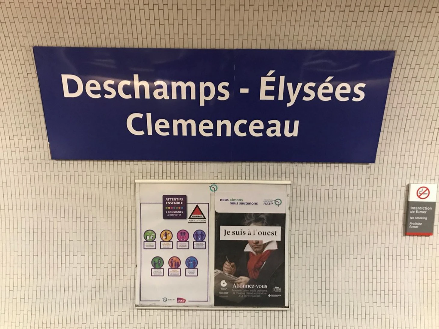Станция Champs-Elysées – Clemenceau (Елисейские поля), теперь временно носит название называется «Deschamps Elysees – Clemenceau» (Поля Дешама).
