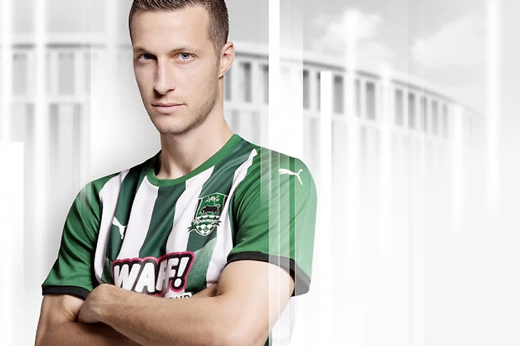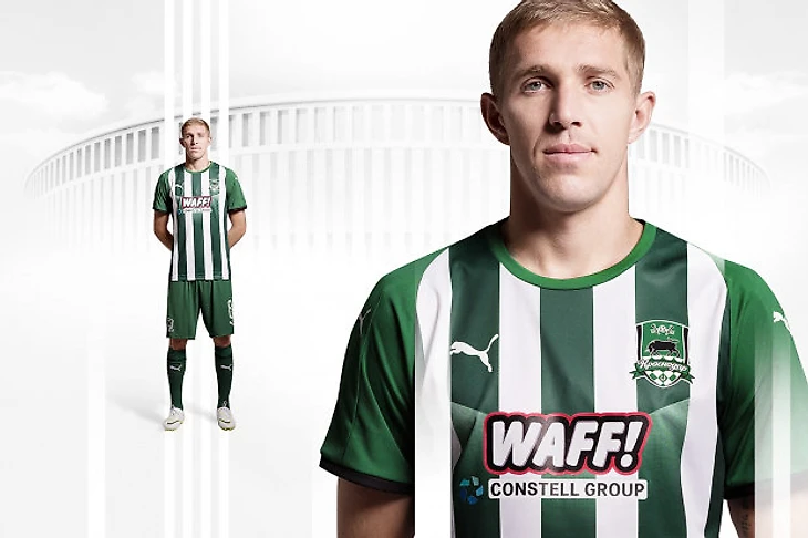 Экипировка окрашена в зеленый и белый цвета. В оформлении футболок использованы вертикальные полосы.