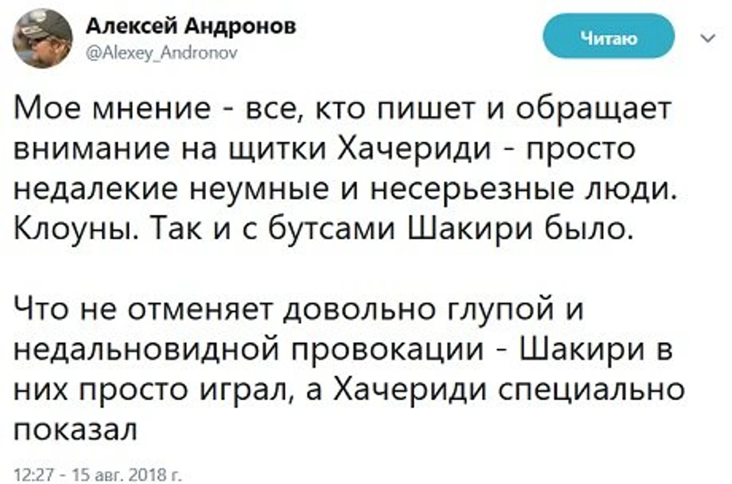 Что не отменяет довольно глупой и недальновидной провокации – Шакири в них просто играл, а Хачериди специально показал», – написал Андронов.