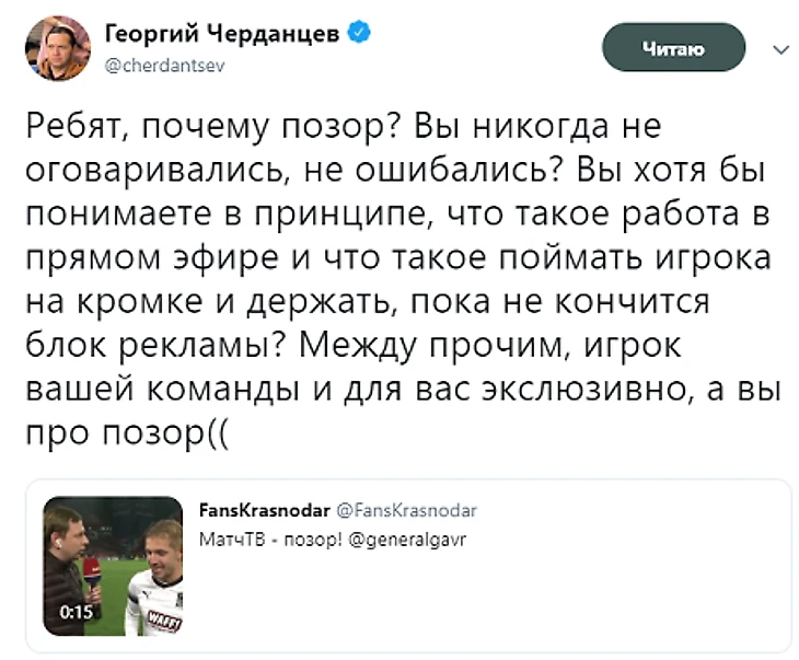 «Ребят, почему позор? Вы никогда не оговаривались, не ошибались? Вы хотя бы понимаете в принципе, что такое работа в прямом эфире и что такое поймать игрока на кромке и держать, пока не кончится блок рекламы? Между прочим, игрок вашей команды и для вас экслюзивно, а вы про позор», – написал Черданцев.