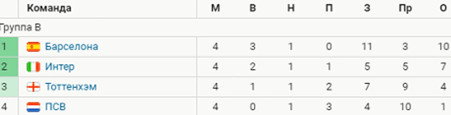 Каталонский клуб первым в этом сезоне гарантировал себе участие в плей-офф. У «Барселоны» 10 очков, у «Интера» 7, на счету «Тоттенхэма» 4.