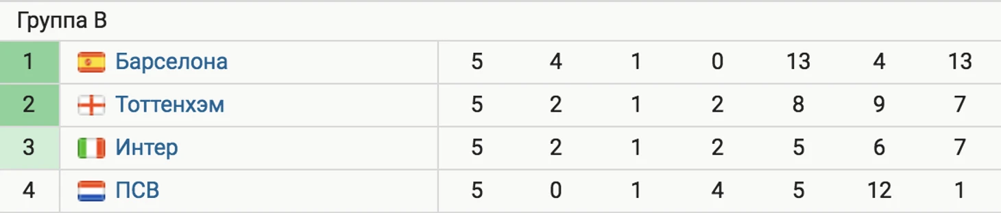 Каталонцы в пяти турах набрали 13 очков и опережают «Тоттенхэм» и «Интер» (по 7 очков), которые поборются за вторую путевку в плей-офф.
