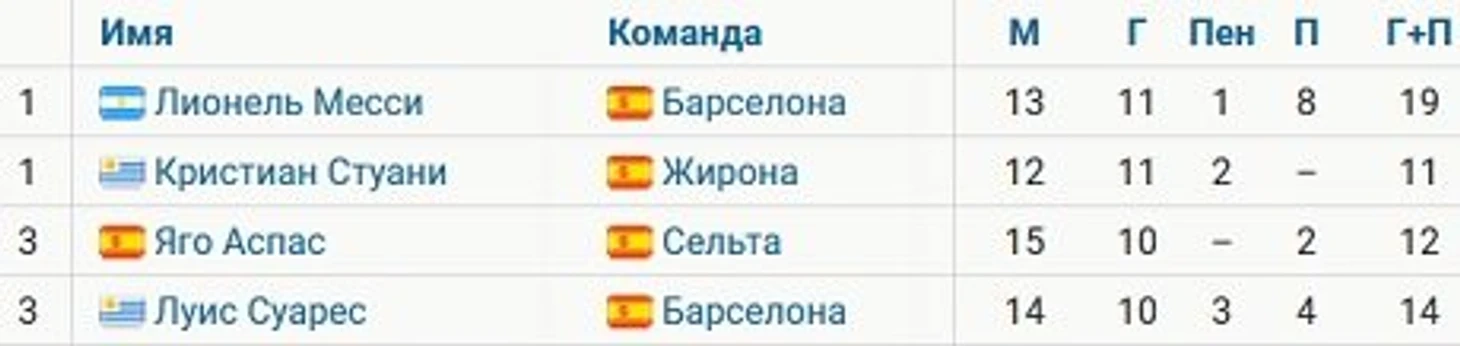 Месси забил два гола и делит первое место в списке бомбардиров с Кристианом Стуани из «Жироны». У них по 11 голов.