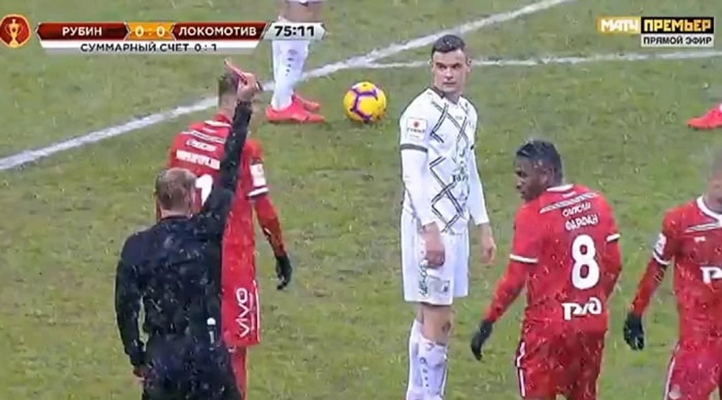 Защитник «Рубина» Уремович получил две желтых карточки в игре с «Локомотивом» за 2 минуты