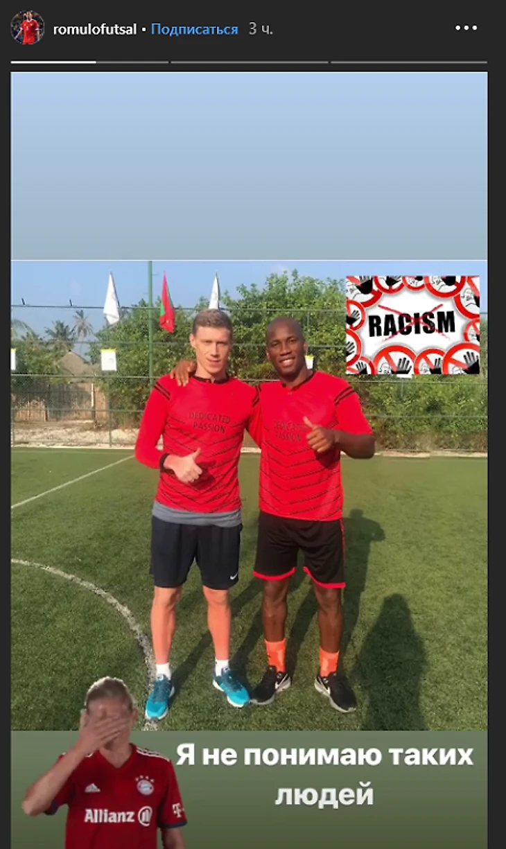 Ромуло в инстаграме опубликовал совместное фото Погребняка с экс-нападающим «Челси» и сборной Кот-д’Ивуара Дидье Дрогба, добавив к ней стикер с зачеркнутым словом «расизм» и подпись: «Я не понимаю таких людей».