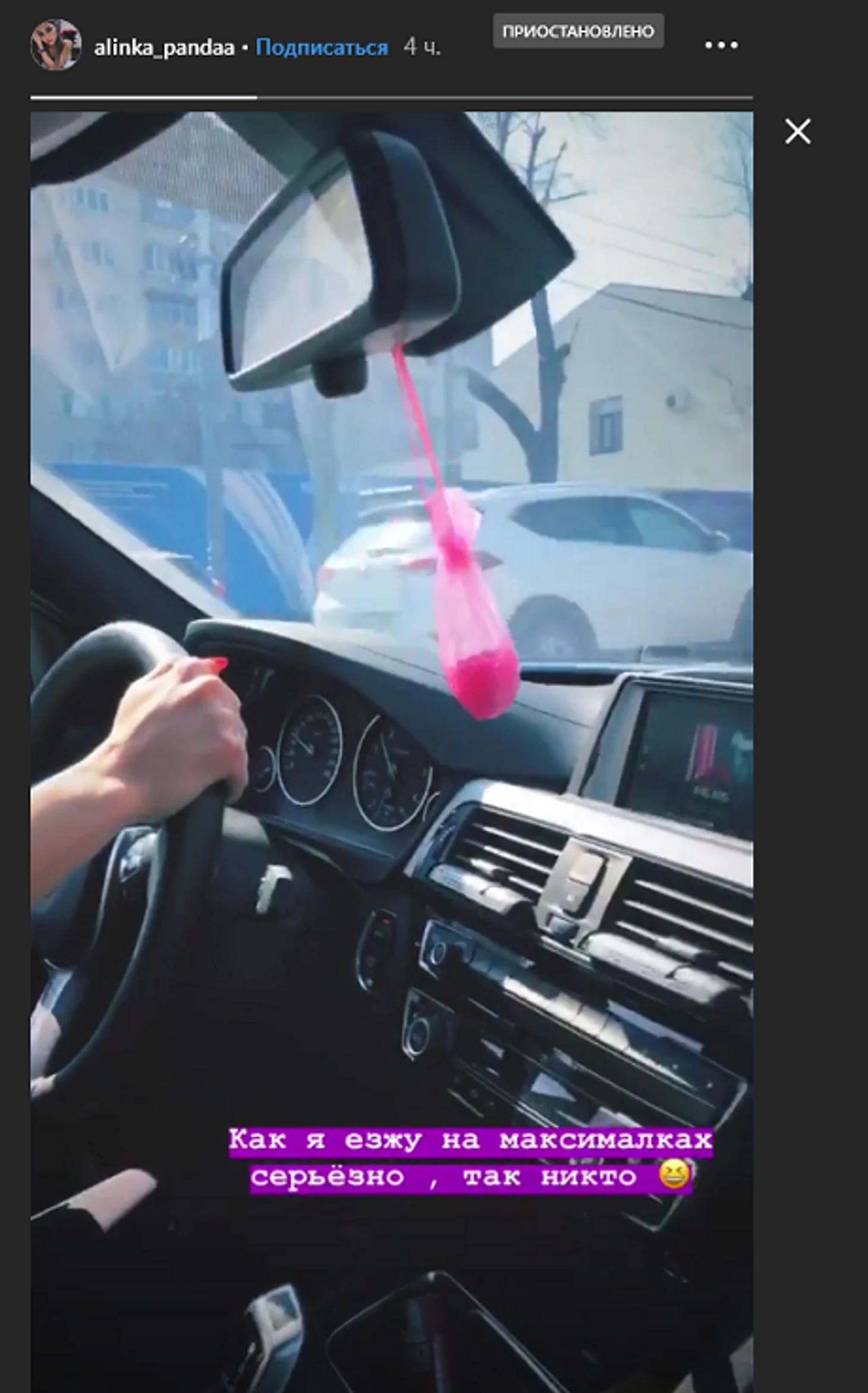 Девушка нападающего «Краснодара» Ивана Игнатьева Алина Дзвелая опубликовала в сторис инстаграма видео, на котором она управляет автомобилем. Предположительно, это BMW третьей серии.
