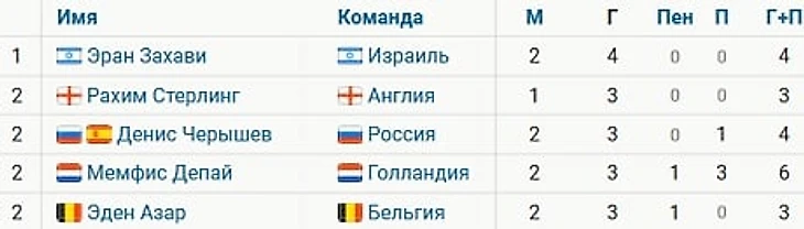 Второе место делят сразу четыре футболиста – англичанин Рахим Стерлинг (3 гола в 1 матче), россиянин Денис Черышев (3 гола в 2 матчах), бельгиец Эден Азар (3 гола в 2 матчах) и голландец Мемфис Депай (3 гола в 2 матчах).
