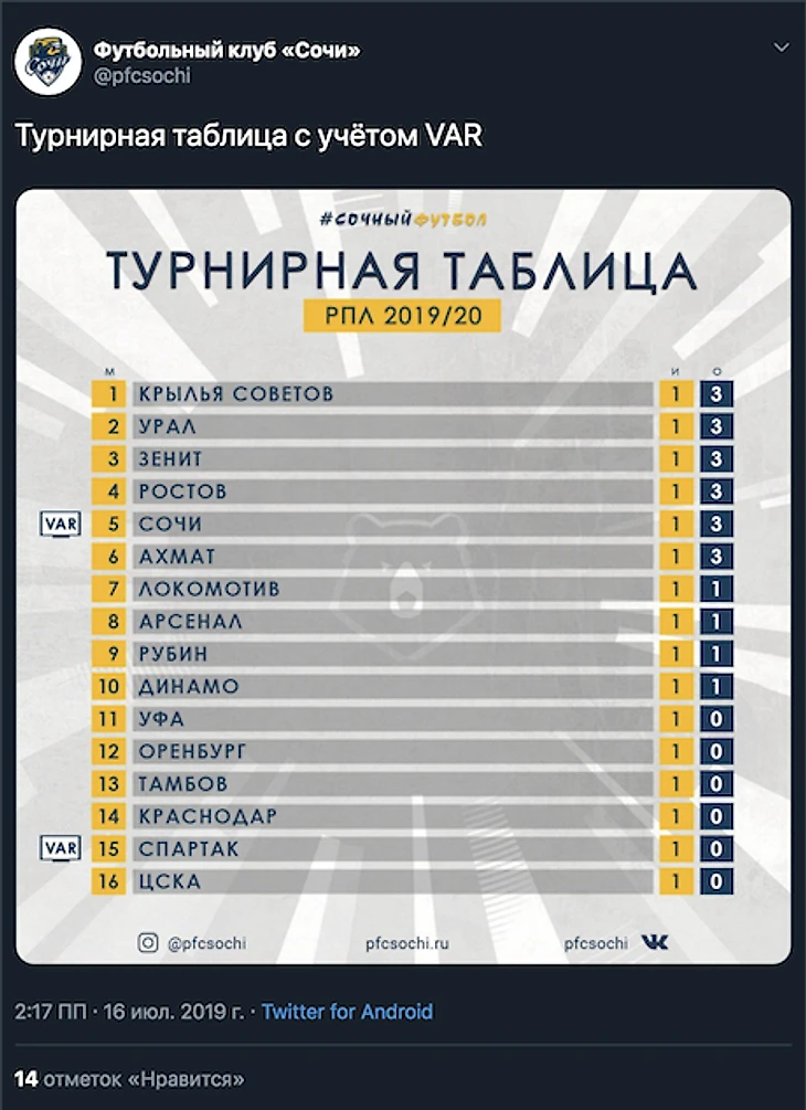 «Турнирная таблица с учетом VAR», – говорится в твиттере «Сочи» в описании таблицы, где дебютант РПЛ с тремя очками занимает 5-е место, а «Спартак», у которого ноль очков, идет в зоне вылета на 15-й позиции.