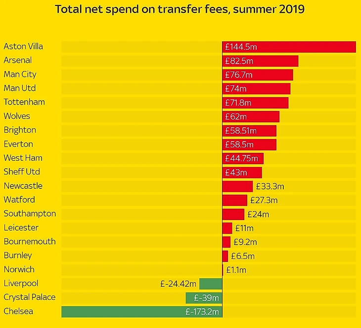Наибольший отрицательный балланс по итогам трансферного окна у «Астон Виллы» (минус 144,5 млн фунтов), «Арсенала» (минус 82 млн) и «Манчестер Сити» (минус 76,7 млн).