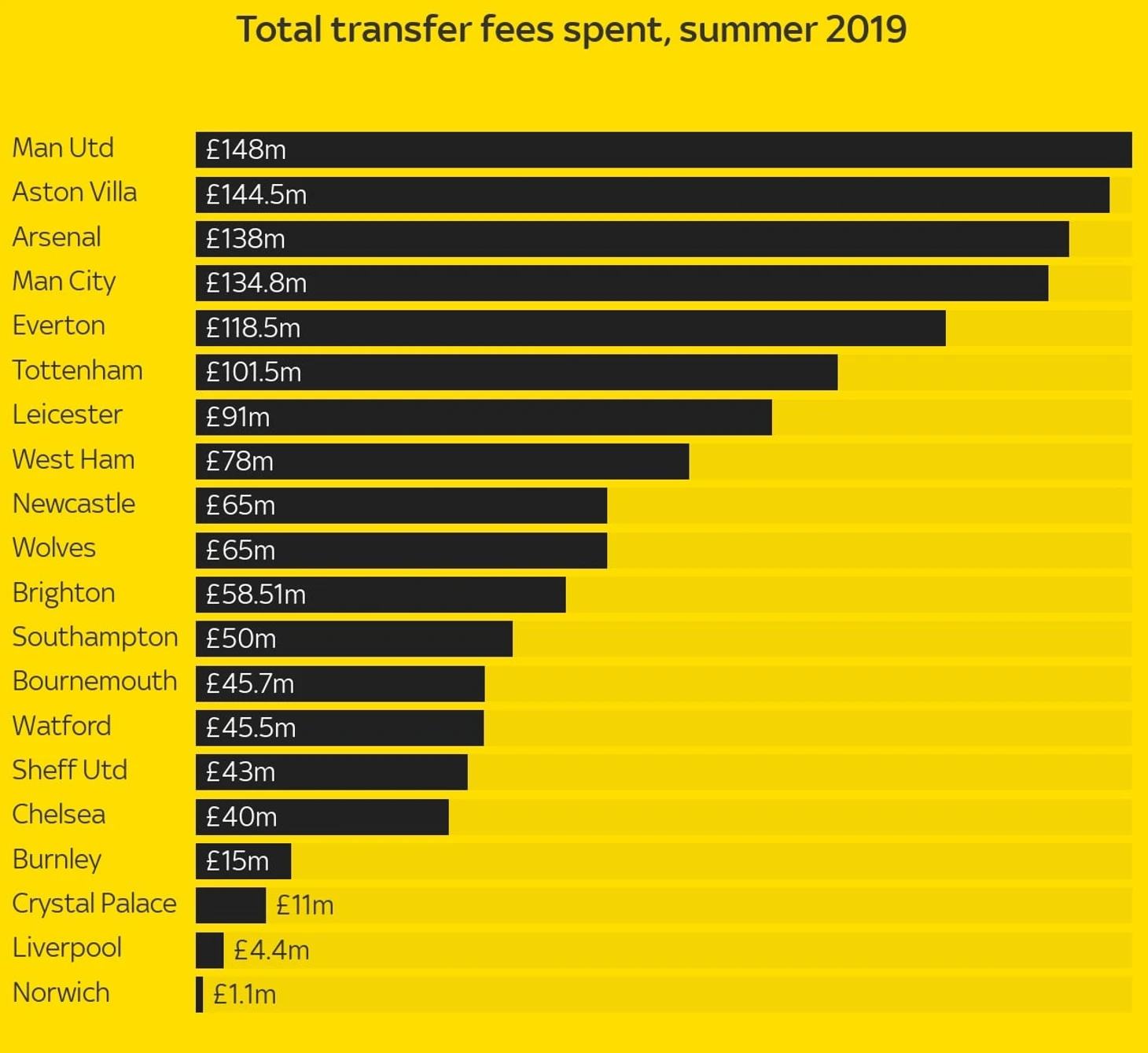 Второе место в рейтинге заняла «Астон Вилла», купившая 12 футболистов на общую сумму 144,5 млн фунтов. Третьим стал «Арсенал», подписавший игроков на 138 миллионов, а также арендовавший Дани Себальоса у «Реала».