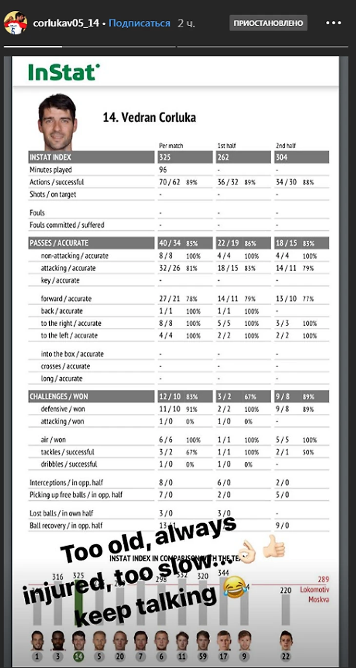 «Слишком старый, вечно травмированный, слишком медленный... Продолжайте болтать 😂», – написал Чорлука в инстаграме, приложив скриншот со своей статистикой.