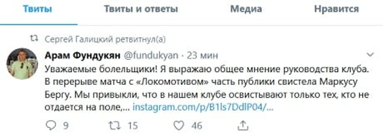 Коммерческий директор «Краснодара» Арам Фундукян обратился к болельщикам, которые освистали нападающего команды Маркуса Берга во время матча 7-го тура РПЛ против «Локомотива» (1:1).