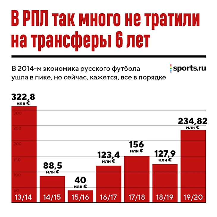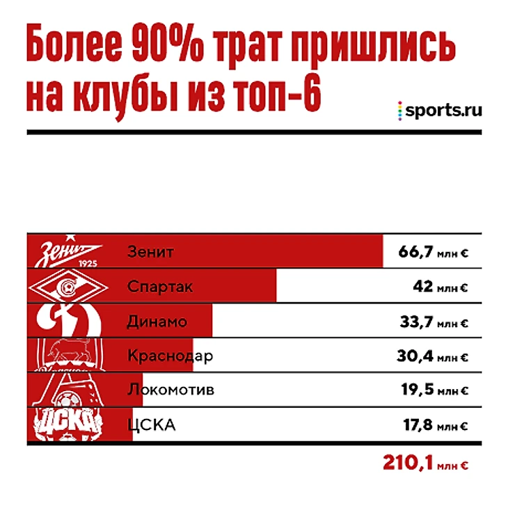 Стоит отметить, что в этот период более 90% трат (210,1 млн) пришлись на топ-6 клубов: «Зенит», «Спартак», «Краснодар», «Динамо», «Локомотив» и ЦСКА.