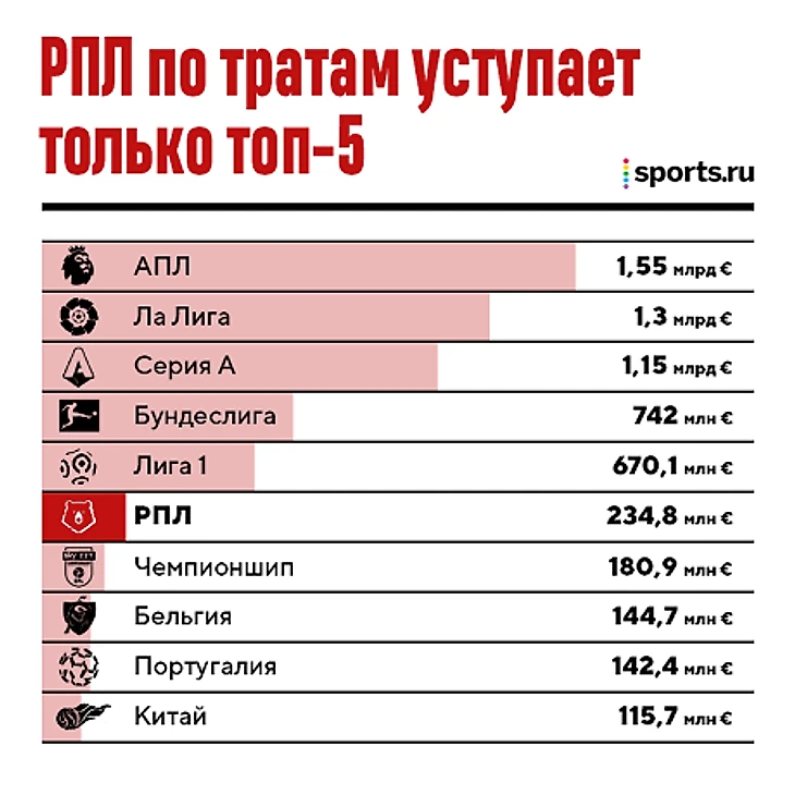 По тратам РПЛ уступила только лигам топ-5: в АПЛ летом потратили 1,55 млрд евро, в Ла Лиге – 1,3 млрд, клубы Серии А купили игроков на 1,15 млрд, клубы Бундслиги – на 742 млн, а французские клубы вложили в трансферы 670,1 млн евро.