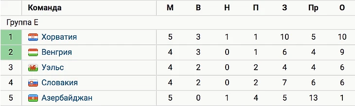 Хорваты, несмотря на потерю очков, остаются лидерами, однако сборная Венгрии, которая сегодня сыграет со Словакией, в случае победы выйдет на первое место.