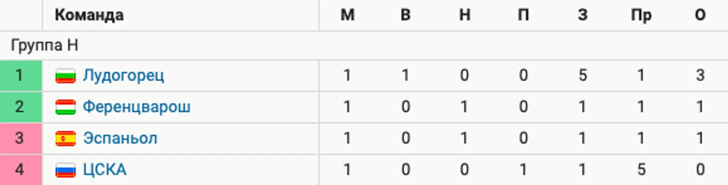 «Лудогорец» возглавил группу. «Ференцварош» и «Эспаньол» набрали по одному очку.