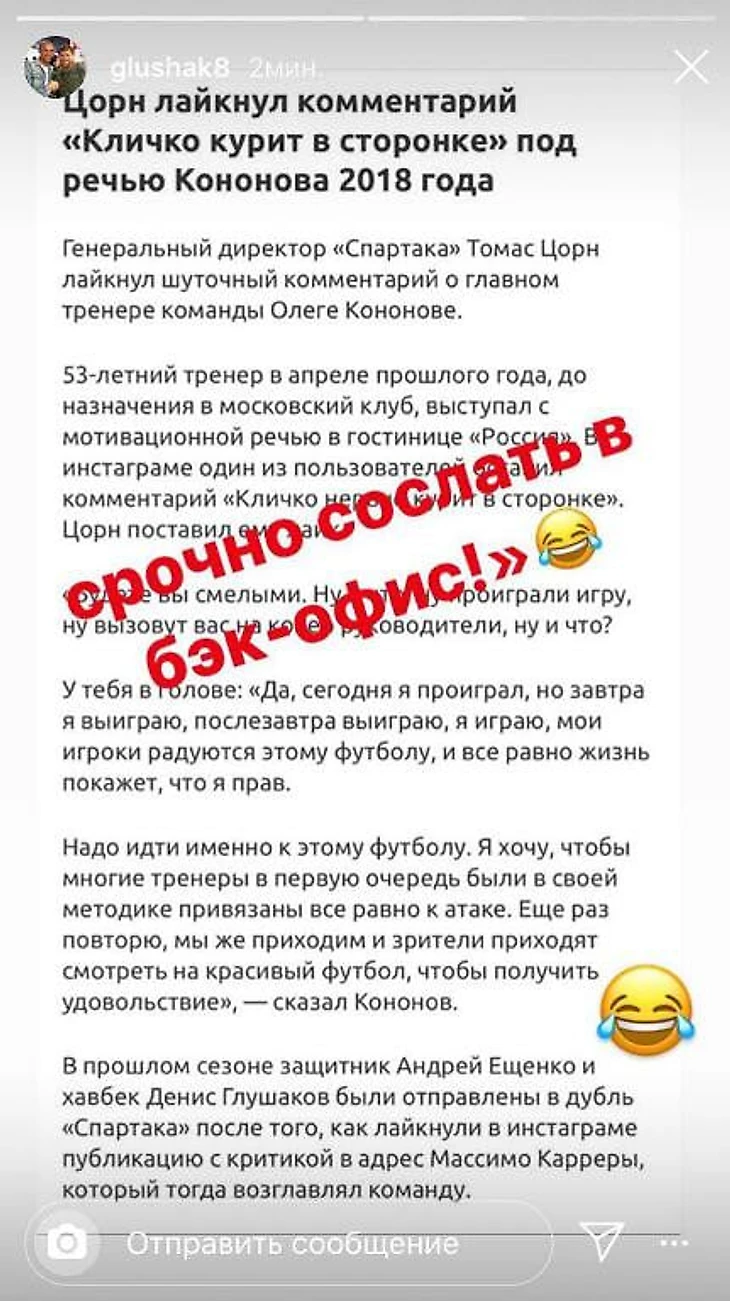 Глушаков отреагировал на лайк Цорна: «Срочно сослать в бэк-офис!»
