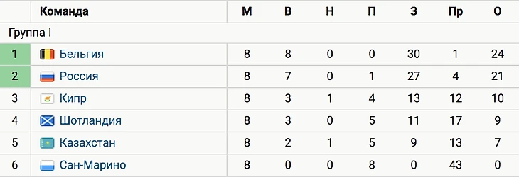 Российская команда сохраняет шансы догнать лидирующую Бельгию, отставая от нее на три очка. Очный матч состоится 16 ноября.