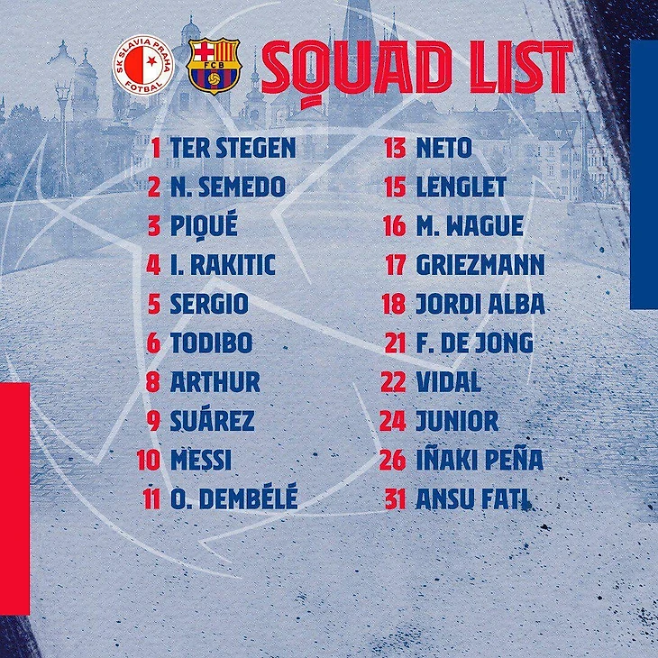 «Барселона» объявила состав на матч 3-го тура группового этапа Лиги чемпионов против пражской «Славии».