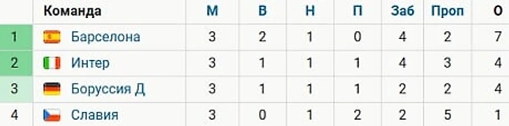 У «Интера» и дортмундской «Боруссии» – по 4 очка, «Славия» замыкает таблицу с одни баллом.