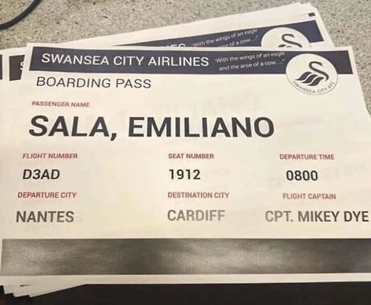 Фанаты «лебедей» напечатали плакаты в виде посадочных талонов на имя Эмилиано Салы – форварда «Нанта», чей самолет упал в Ла-Манш во время перелета в Кардифф.