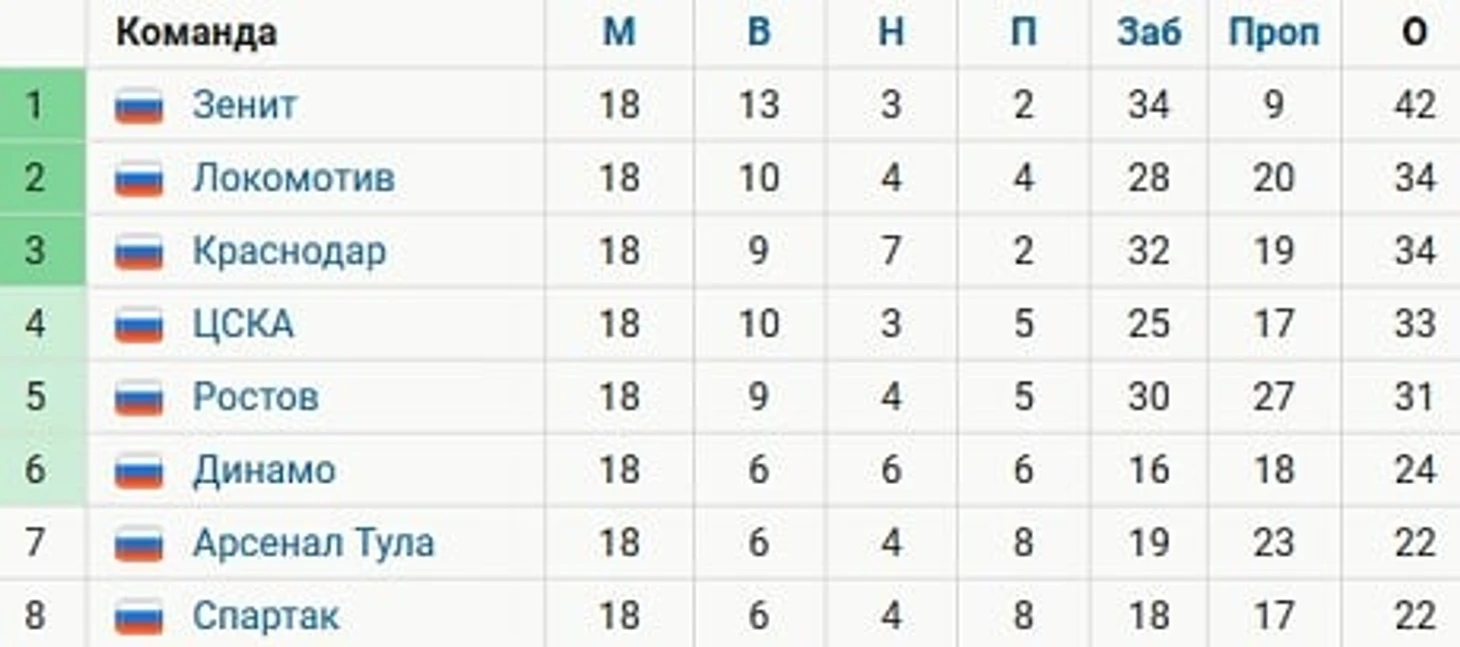 «Зенит» лидирует в РПЛ с отрывом в 8 очков от «Локомотива» и «Краснодара», «Спартак» отстает на 20