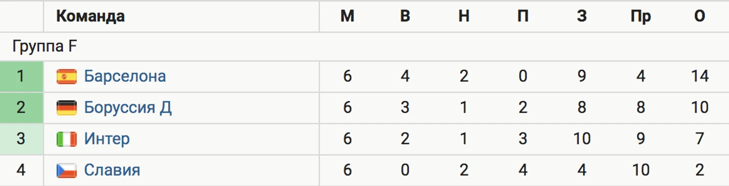 «Интер» финишировал третьим в группе F с 7 очками, уступив «Боруссии» (10 очков) и «Барселоне» (14).