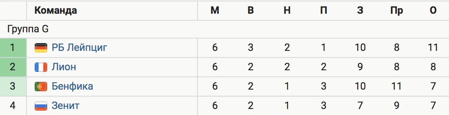 В группе G третье место заняла «Бенфика», набравшая 7 очков. Столько же очков у «Зенита», но «орлы» опередили соперника по результатам личных встреч (3:0, 1:3).