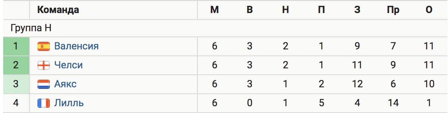 Третье место в группе H занял «Аякс», проигравший в 6-м туре дома «Валенсии» (0:1). Амстердамцы набрали 10 очков, отстав от испанского клуба, а также от «Челси» на одно очко.