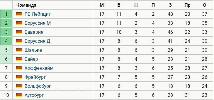 Таким образом, «Лейпциг» с 37 очками возглавил таблицу, опередив «Боруссию» на 2 балла.