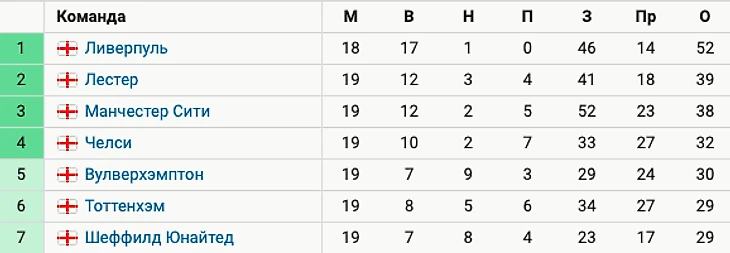 По итогам первой части сезона в турнирной таблице АПЛ лидирует «Ливерпуль», набравший 52 очка. «Красные» имеют еще один матч в запасе, поскольку игру с «Вест Хэмом» перенесли на январь из-за клубного чемпионата мира.