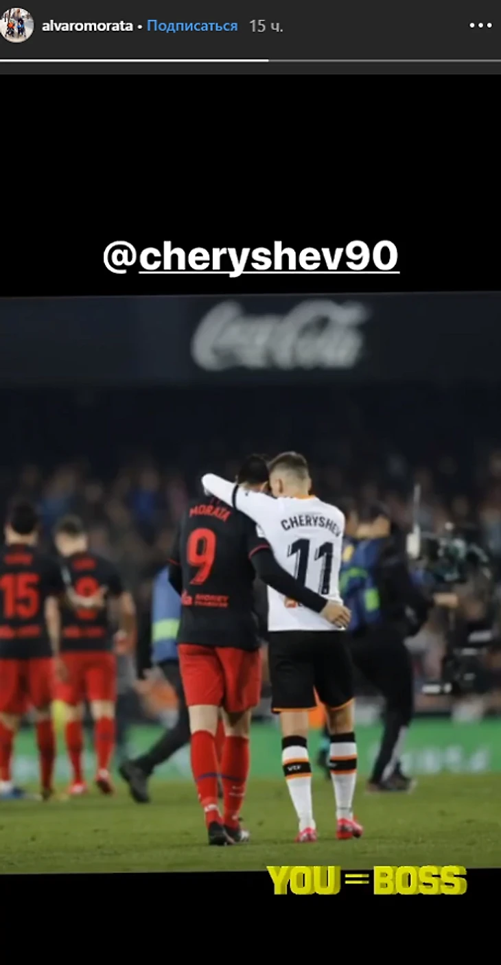 Нападающий «Атлетико» Альваро Мората опубликовал фотографию с полузащитником «Валенсии» Денисом Черышевым после матча команд (2:2).