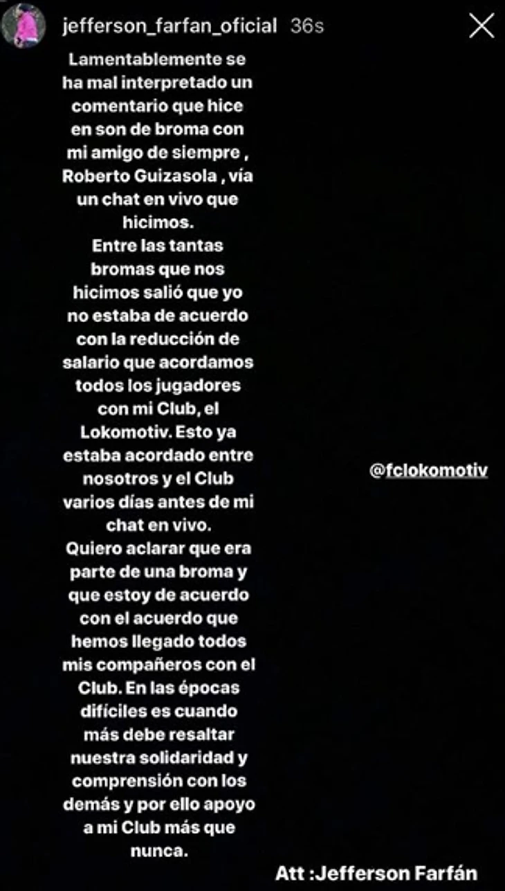 Полузащитник «Локомотива» Джефферсон Фарфан опубликовал комментарий касательно своих слов о снижении зарплат в клубе в условиях пандемии коронавируса.