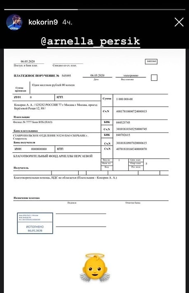 Кокорин подтвердил перевод, опубликовав платежное поручение в инстаграме.