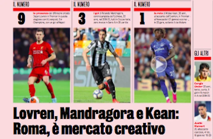 «Рома» может пригласить трех игроков. Это защитник Деян Ловрен, хавбек «Удинезе» Роландо Мандрагора и нападающий «Эвертона» Мойзе Кин, сообщается в печатной версии сегодняшнего выпуска La Gazzetta dello Sport.