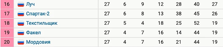 В зоне вылета ФНЛ находятся владивостокский «Луч» (16-е место), который снялся и не сыграет в следующем сезоне ФНЛ, «Спартак-2» (17-е), «Текстильщик» (18-е), «Факел» (19-е) и «Мордовия» (20-е).