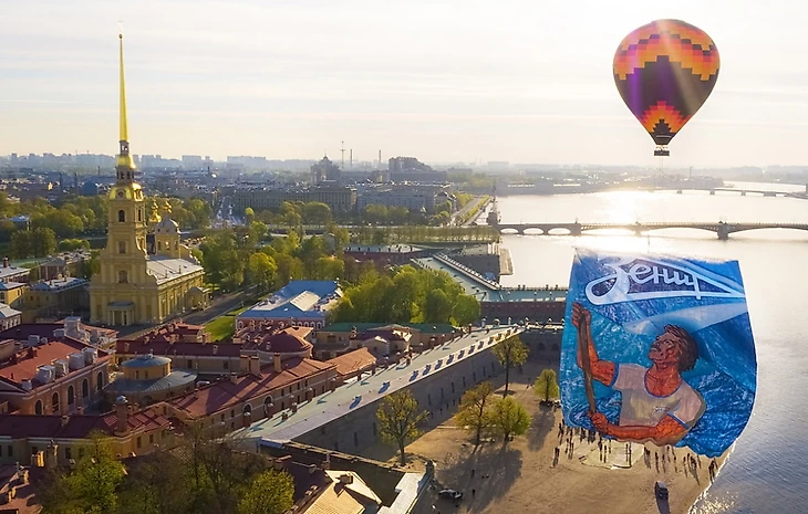 Петербургский клуб запустил с берега Невы на Заячьем острове аэростат с баннером, изображающим болельщика «Зенита». Его создали фанаты петербуржцев.