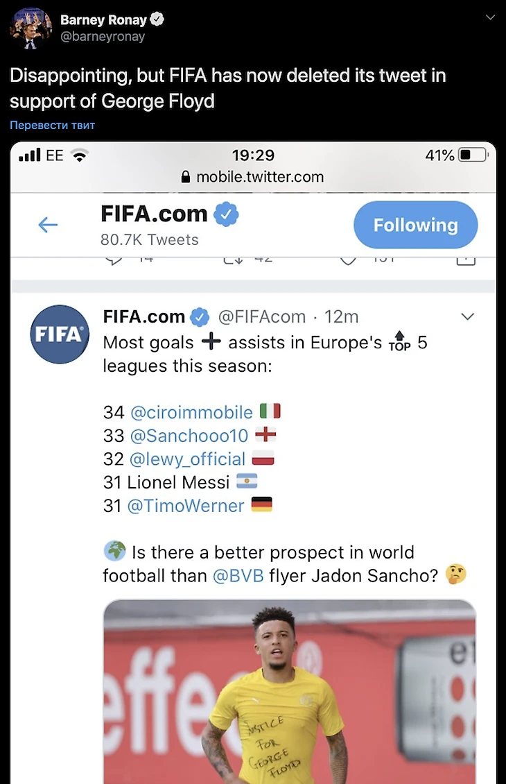 В посте на фото был вингер дортмундской «Боруссии» Джейдон Санчо в футболке с надписью «правосудие для Джорджа», посвященной убийству Джорджа Флойда полицейским. Об этом сообщил журналист The Guardian Барни Роней.