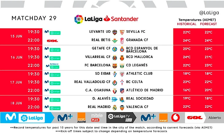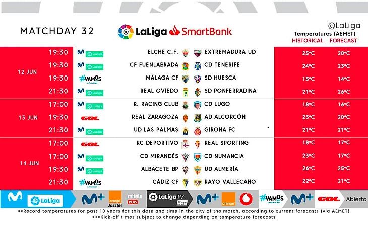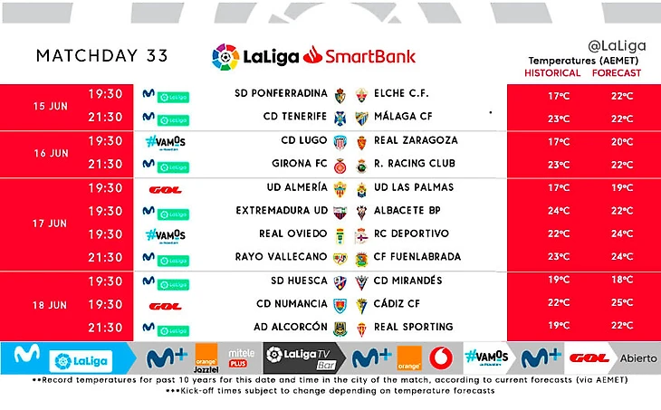 Расписание матчей 28-го, 29-го туров Ла Лиги и 32-го, 33-го туров Сегунды представлено ниже. На изображениях указано местное время.